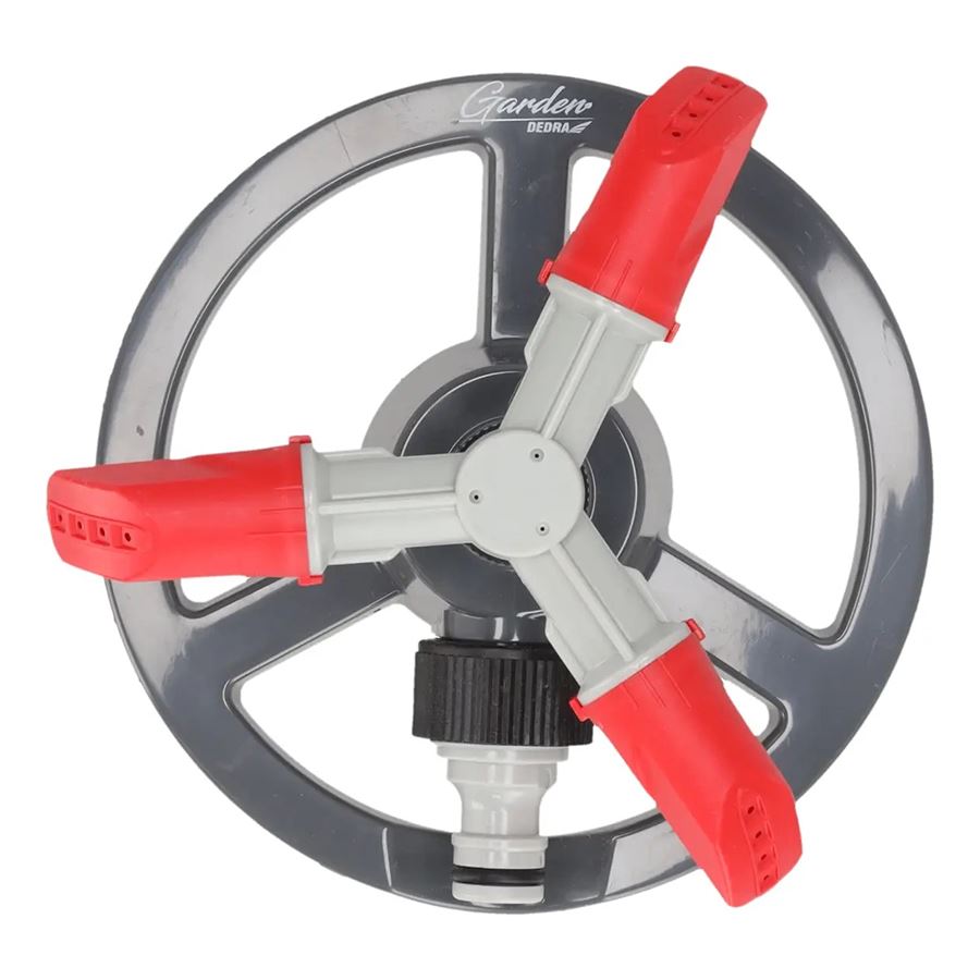 3-ramenný rotačný zavlažovač DEDRA, na podstavciTrojramenný rotačný zavlažovač je súčasťou zavlažovacieho systému, ktorýj e vhodný pre väčšie plochy. Vďakatrom hlaviciam a rotačnému pohybu účinne pokryje až 85 m2 (priemerná zavlažovacia plocha do 11 m). Postrekovač umožňuje nastavenie uhlap o s tr ek u , aby sa tvar vodného plášťa prispôsobil zavlažovanej ploche. Veľký priemer základne (6") zaisťuje stabilitu a zabraňuje prevráteniu postrekovača aj pri vysokom tlaku vody. Vďaka použitiu rýchlospojky 1/2" je pripojenie k hadici mimoriadne jednoduché a robustný materiál tela postrekovača (vysokokvalitný plast ABS+PP) zaručuje dostatočnú pevnosť.Vlastnosti: