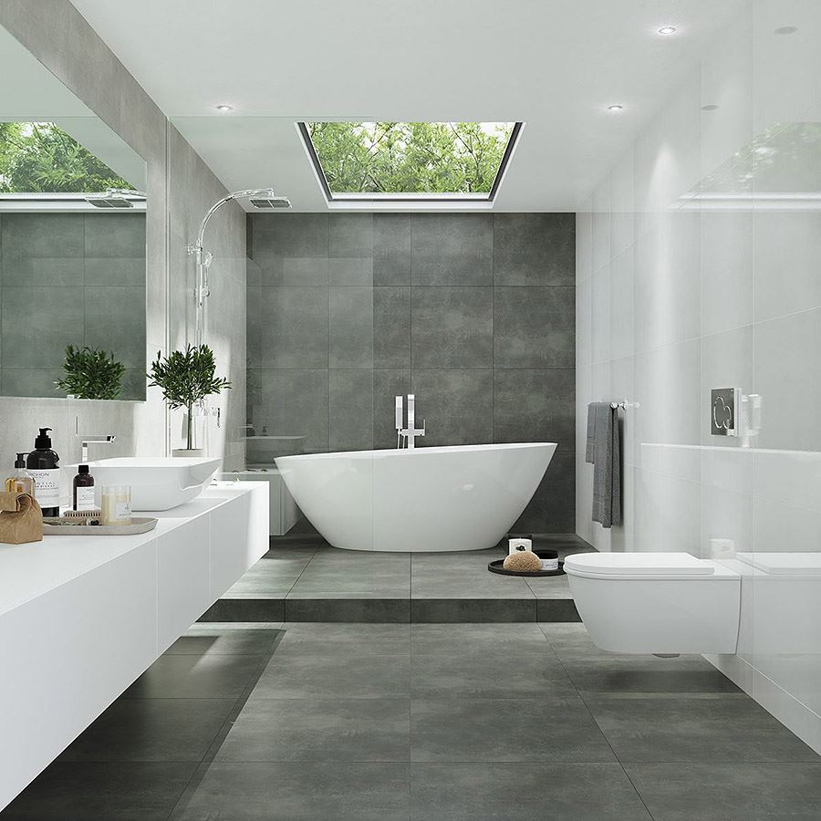 Mrazuvzdorná a rektifikovaná dlažba v šedej farbe v betónovo...