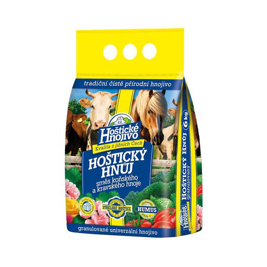 Hoštický hnoj je čisto prírodné - organické hnojivo (zmes kravského a konského hnoja s rohovinou). Hodí sa nielen pre univerzálne použitie v celej záhrade pre kvety a okrasné rastliny, ale obzvlášť pre zdravú výživu ovocia a zeleniny.Zloženie:5% N + 2% P205 + 3% K20Použitie:Aplikuje sa na jar alebo na jeseň rozhodením po povrchu zeminy a potom sa vhodným náradím mierne zapraví do pôdy a dostatočne zavlaží. Neobsahuje klíčivé semená burín.Dávkovanie:Základné hnojenie pred výsadbou: 1,3 - 2,5 kg na 10 m2, v skleníku 1,5 - 3 kg na 10 m2. Dávka na jeden 50 cm kvetináč s balkónovými rastlinami 150 - 200 g Ruže a trvalky 1,3 - 2 kg na 10 m2. Zelenina a ovocie 250 - 300 g na 1 rastlinu, ihličnany a iné okrasné kríky 500 - 700 g na 1 rastlinu. Pre jesenné vyhnojenie odporúčame 2 kg na 10 m2.