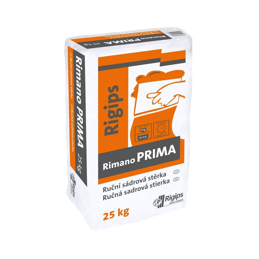Hladená sadrová tenkovrstvová omietka pre ručné spracovanie. Chemicky sa jedná o hemihydrát síranu vápenatého so zušľachťujúcimi prísadami.Použitie:Rimano PRIMA je hladká sadrová tenkovrstvová omietka, vhodná na relatívne hladké podklady (napr. hladké betónové plochy alebo pórobetón). Omietka môže byť nanesená na hladké nesavé betónové plochy, až po ich úprave náterom Rikombi–Kontakt. Možno ju použiť aj na celoplošné omietanie pórobetónových presných tvárnic a nie je potrebné plošné armovanie sieťkou. Materiál je vhodný aj na vyplnenie trhlín, dier a rýh. Výhodou tejto omietky je ľahká spracovateľnosť, dobrá priľnavosť a nízka spotreba. Je vhodná ako podklad pod maľbu, tapety, lak aj disperzné nátery.Odporučená hrúbka omietky je 3 – 6 mm.Spracovanie omietky:Zmes omietky sa vsype do čistej vody a po piatich minútach sa rozmieša do hladka ručne alebo elektrickou metlou. Zmeny pomeru sadry a vody sa prejavia na vlastnostiach spracovávanej zmesi, hlavne dobou tuhnutia a výslednou pevnosťou. Po dobu spracovateľnosti omietky, ktorá je udaná na balení, sú zachované parametre spracovania (zámesové pomery, doba spracovateľnosti) podľa údajov výrobcu. Po uvedenej dobe spracovateľnosti sa môžu parametre spracovania omietky odchyľovať od údajov výrobcu. Aj napriek tomu, pokiaľ je materiál správne skladovaný a spracovaný do 48 mesiacov od dátumu výroby, zostávajú zachované požadované parametre konečnej funkcie v stavbe (prídržnosť, pevnosť).Skladovanie omietky:Produkt je nutné skladovať v suchom prostredí. Pôsobením vlhkosti na produkt pred jeho spracovaním môže nastať zmena fyzikálnych vlastností, resp. zníženie reaktívnosti s vodou. K ochrane produktu počas alebo pred jeho spracovaním je nutné otvorené alebo porušené vrecia náležite ochrániť pred pôsobením vzdušnej vlhkosti.